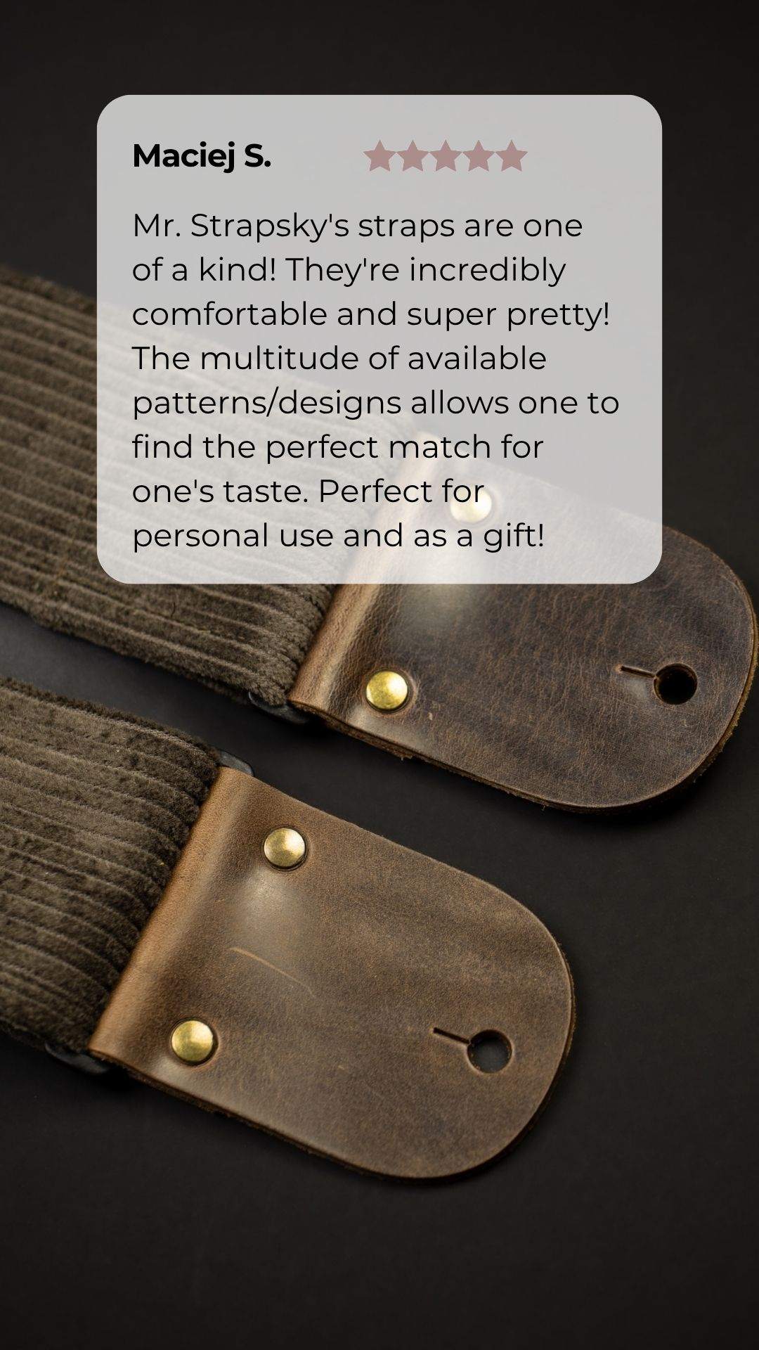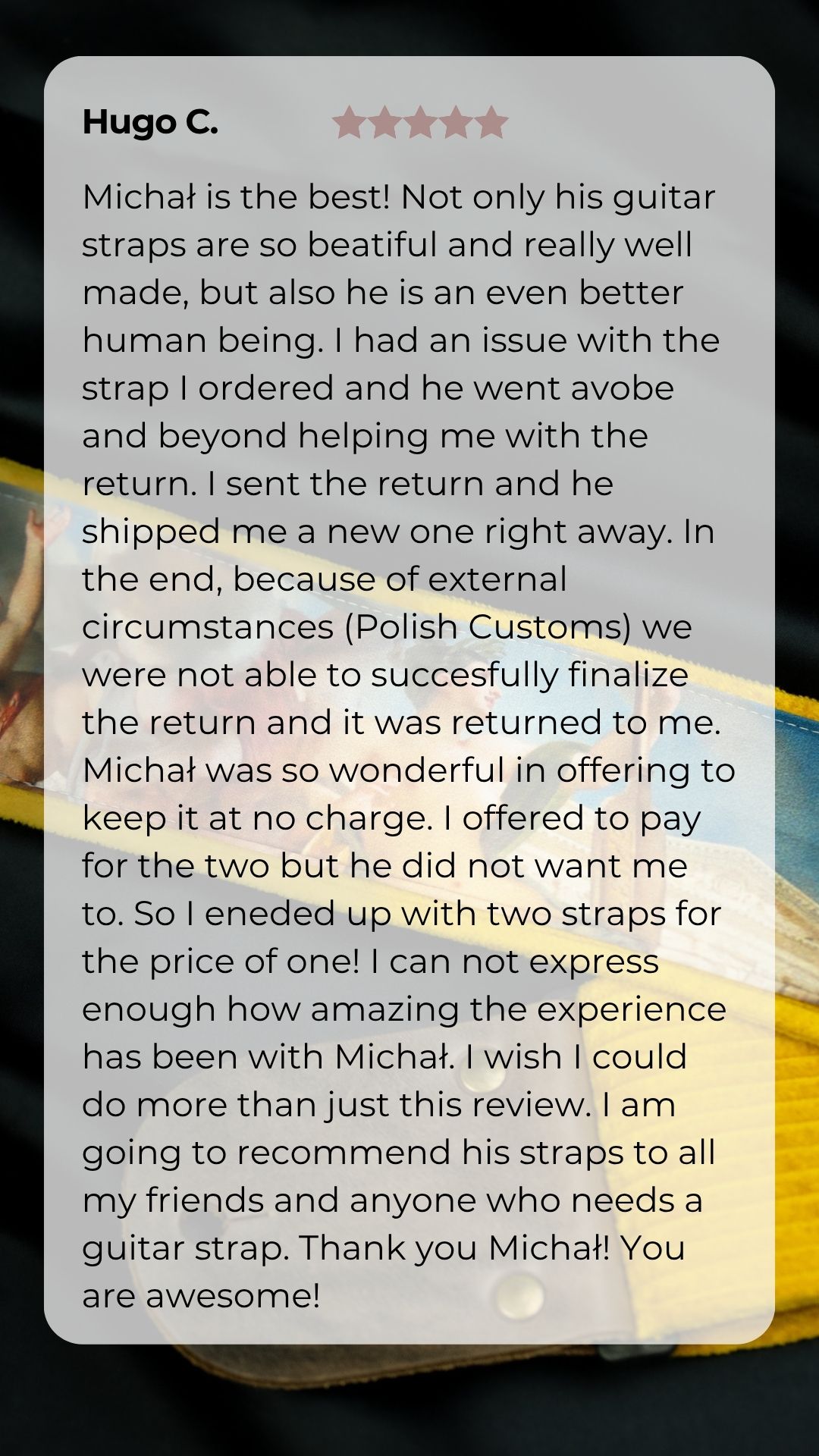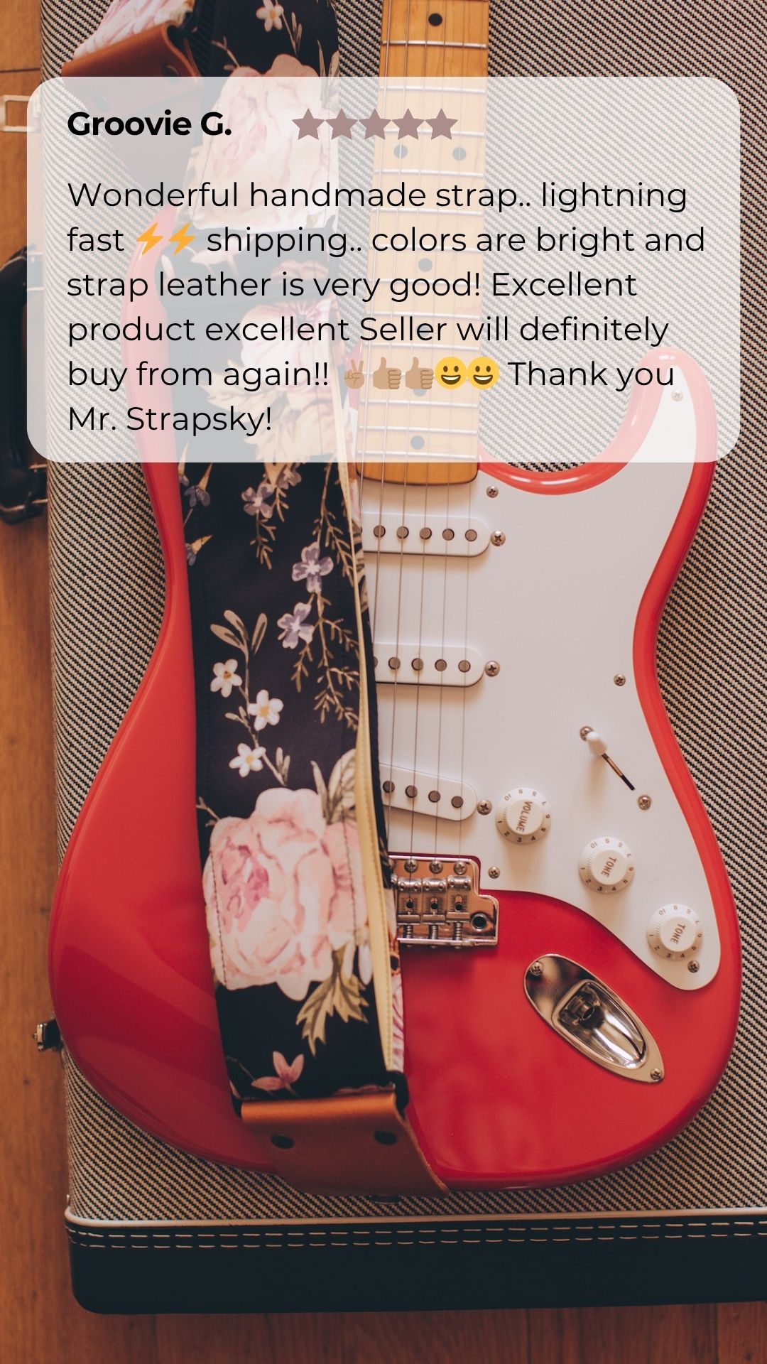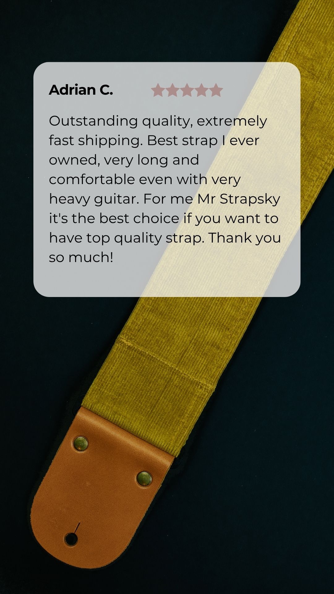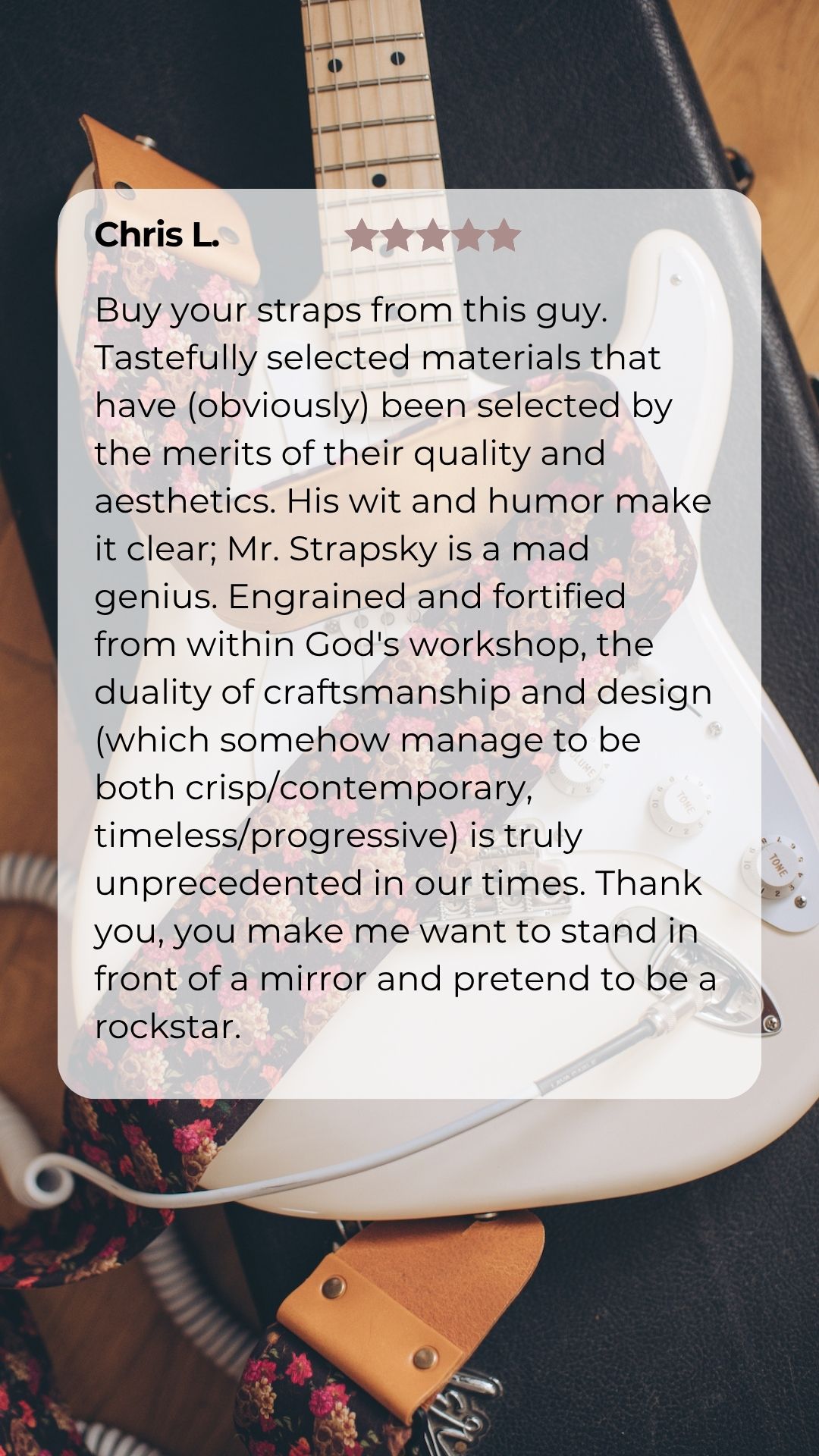 Every review you see here is 100% real written by musicians who actually play, tour, and record with my straps. You can check them any time on Mr. Strapsky Reverb or Google. This whole thing keeps growing naturally, word of mouth, no tricks. One word pops up again and again in those reviews: quality and that’s not by accident. From day one, I’ve tried to make straps that do more than just hold a guitar. Each one’s made by hand, with care, and solid materials, because I really believe every player deserves something reliable, comfortable, and made to last people keep saying the same things. That the leather is super soft, the stitching stays strong for years and the designs actually stand out. It’s not just about how they look. They talk about how the straps of Mr. Strapsky feel after hours of playing and for me, that’s huge. Whether you’re gigging all the time or just playing at home, that kind of comfort matters and so does trust.