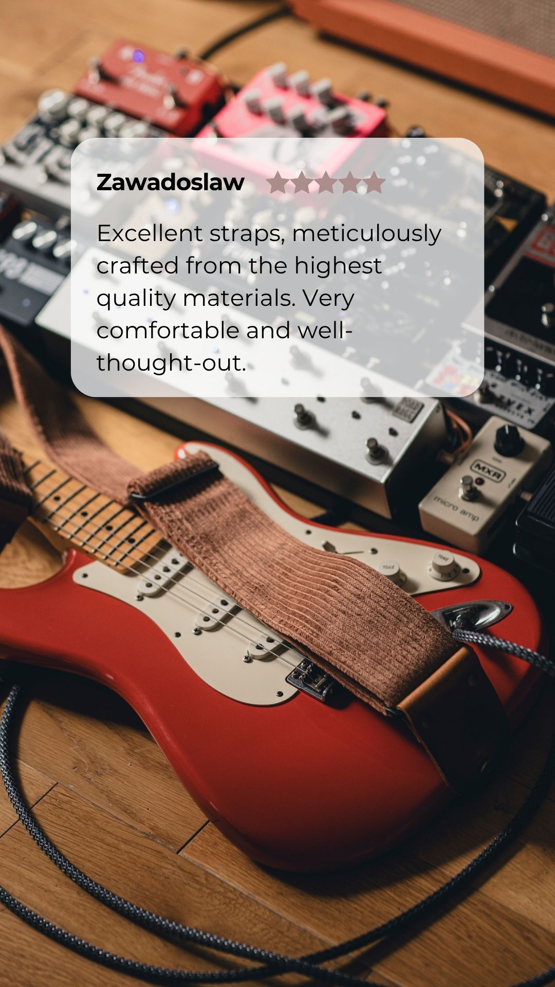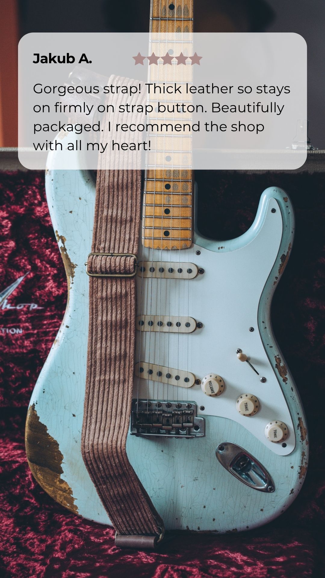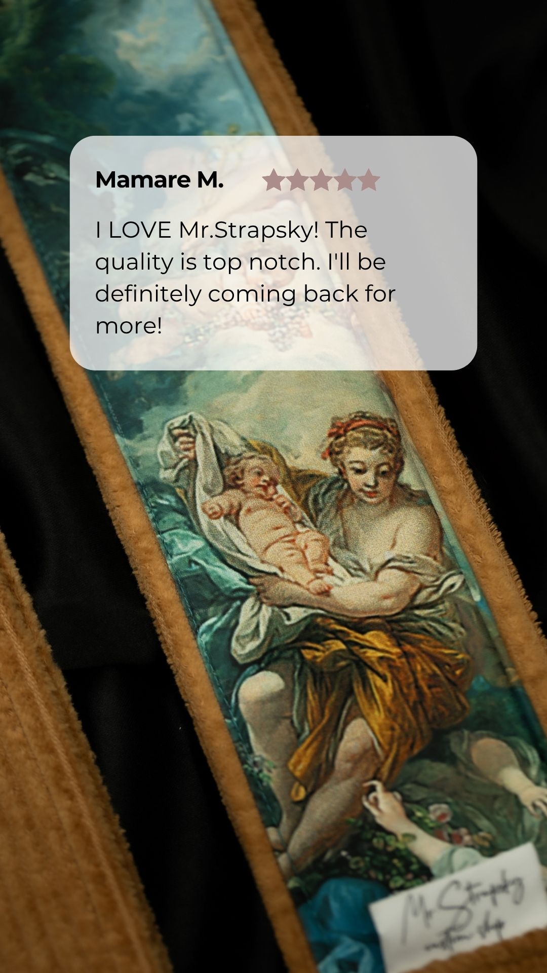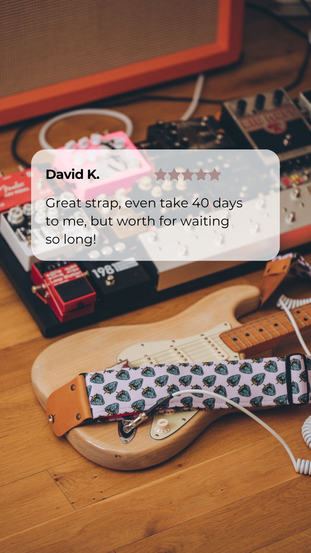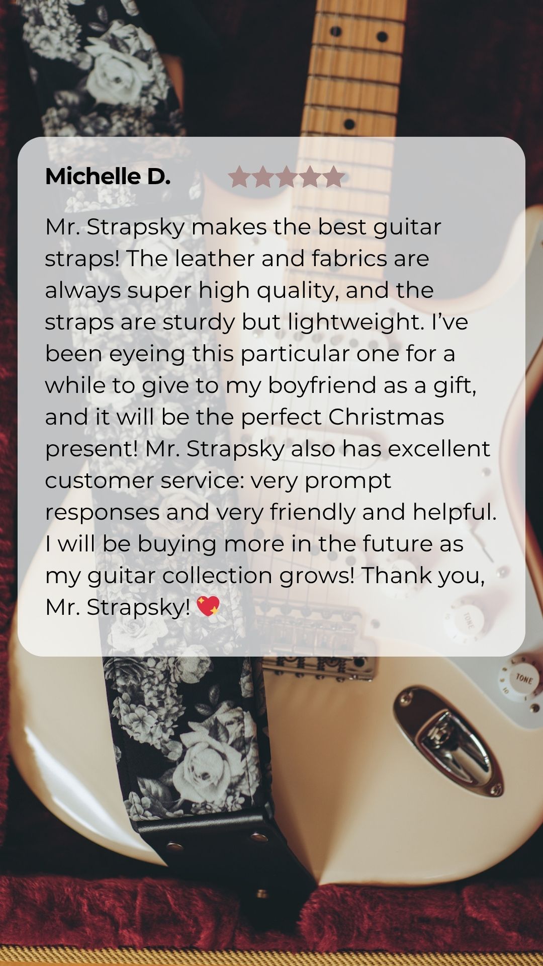 Every review you see here is 100% real written by musicians who actually play, tour, and record with my straps. You can check them any time on Mr. Strapsky Reverb or Google. This whole thing keeps growing naturally, word of mouth, no tricks. One word pops up again and again in those reviews: quality and that’s not by accident. From day one, I’ve tried to make straps that do more than just hold a guitar. Each one’s made by hand, with care, and solid materials, because I really believe every player deserves something reliable, comfortable, and made to last people keep saying the same things. That the leather is super soft, the stitching stays strong for years and the designs actually stand out. It’s not just about how they look. They talk about how the straps of Mr. Strapsky feel after hours of playing and for me, that’s huge. Whether you’re gigging all the time or just playing at home, that kind of comfort matters and so does trust.