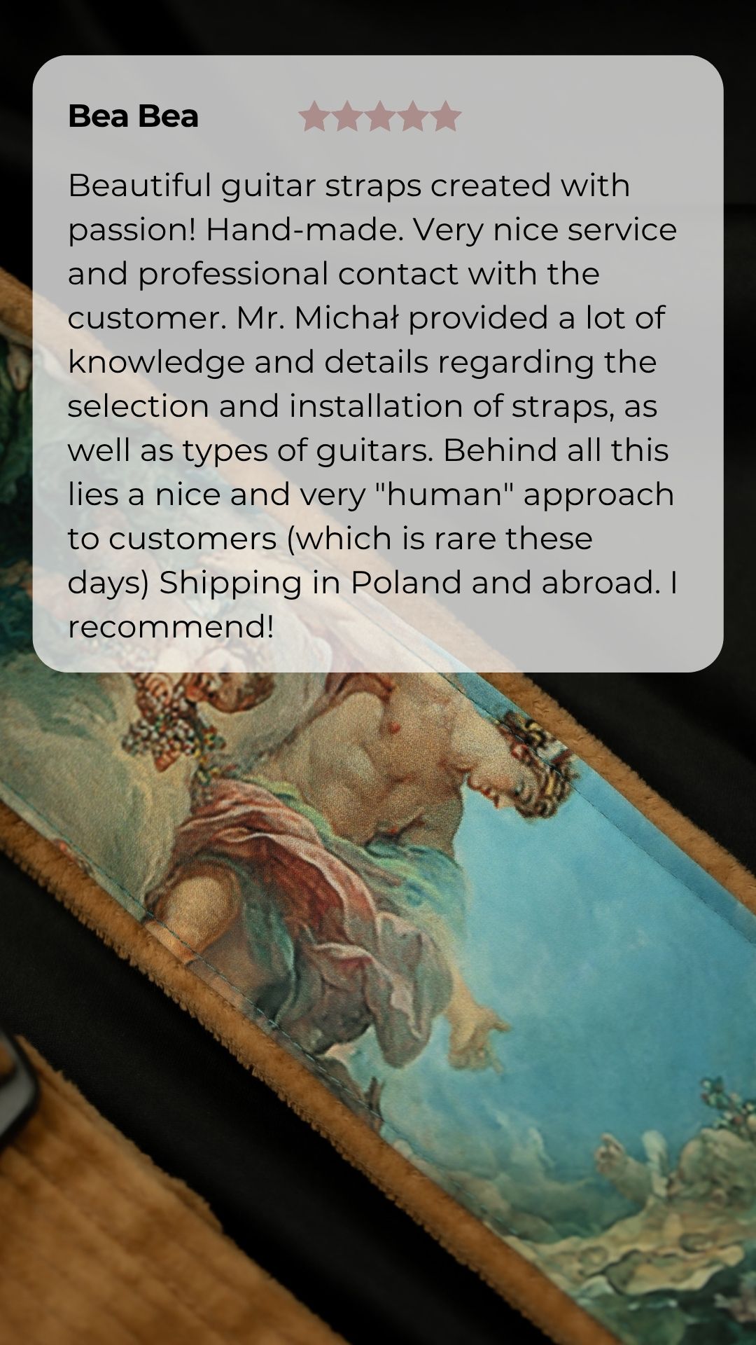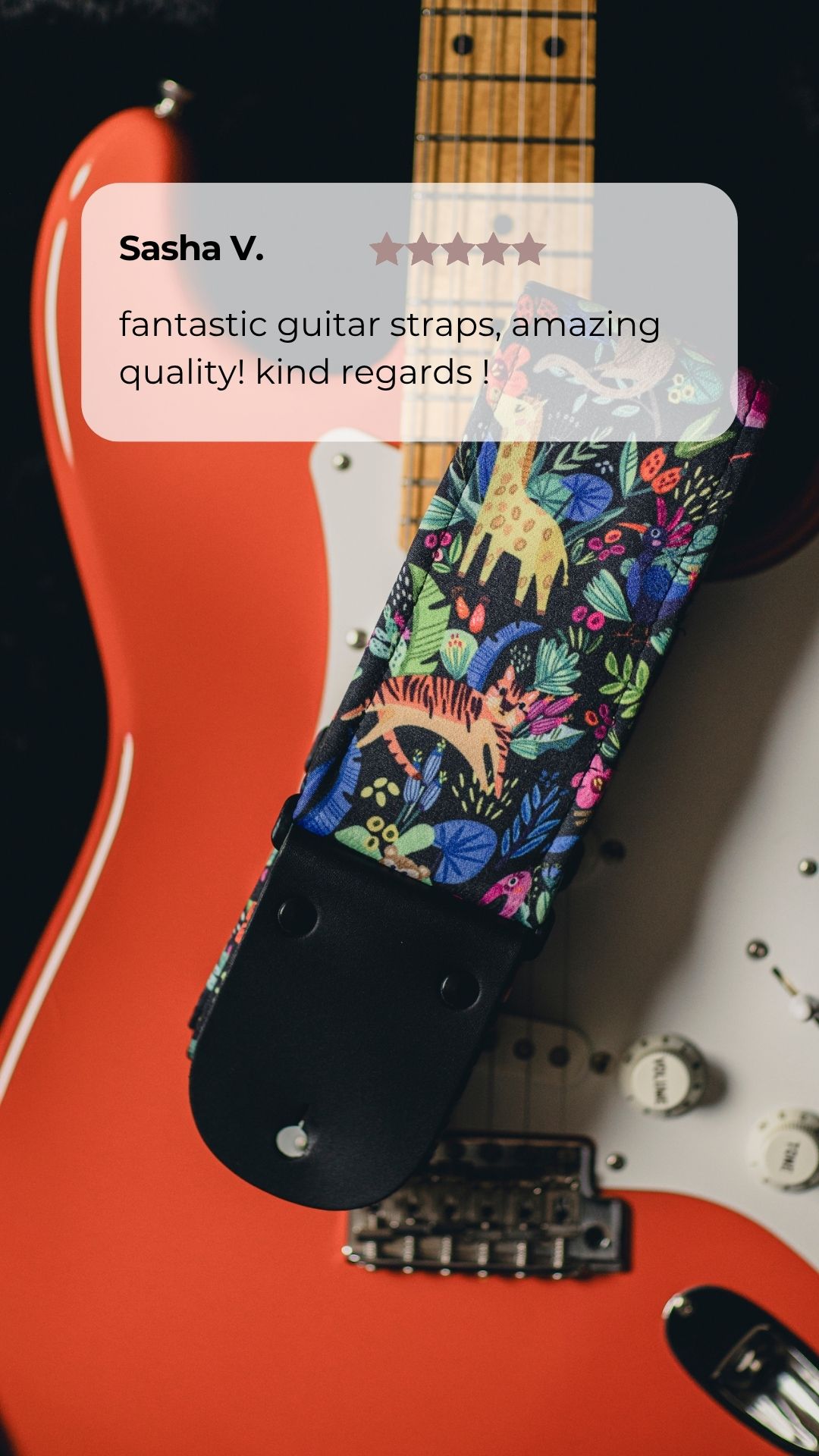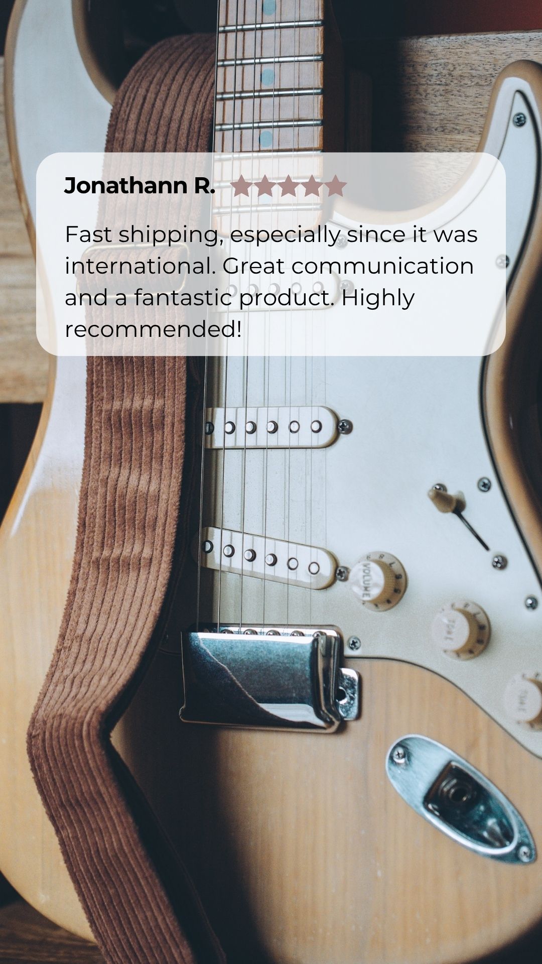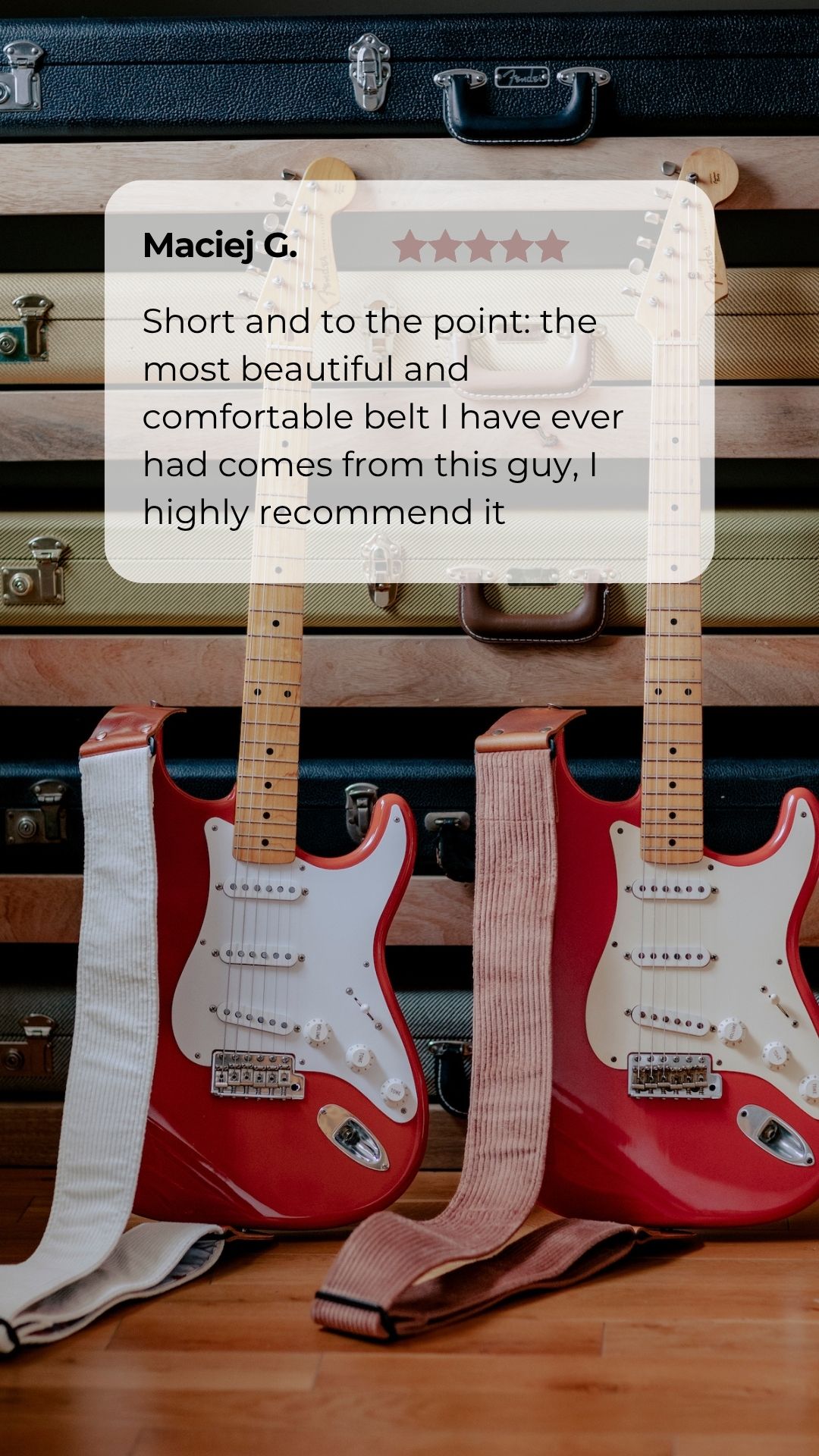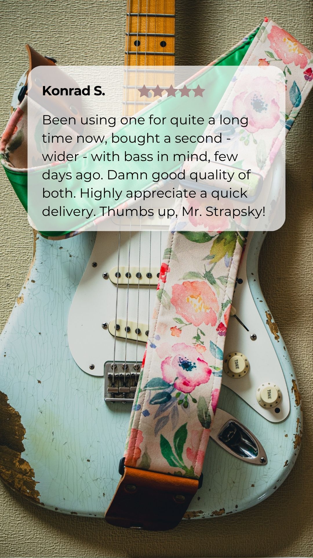 Every review you see here is 100% real written by musicians who actually play, tour, and record with my straps. You can check them any time on Mr. Strapsky Reverb or Google. This whole thing keeps growing naturally, word of mouth, no tricks. One word pops up again and again in those reviews: quality and that’s not by accident. From day one, I’ve tried to make straps that do more than just hold a guitar. Each one’s made by hand, with care, and solid materials, because I really believe every player deserves something reliable, comfortable, and made to last people keep saying the same things. That the leather is super soft, the stitching stays strong for years and the designs actually stand out. It’s not just about how they look. They talk about how the straps of Mr. Strapsky feel after hours of playing and for me, that’s huge. Whether you’re gigging all the time or just playing at home, that kind of comfort matters and so does trust.