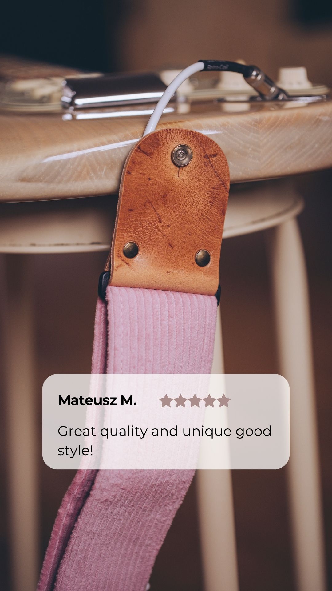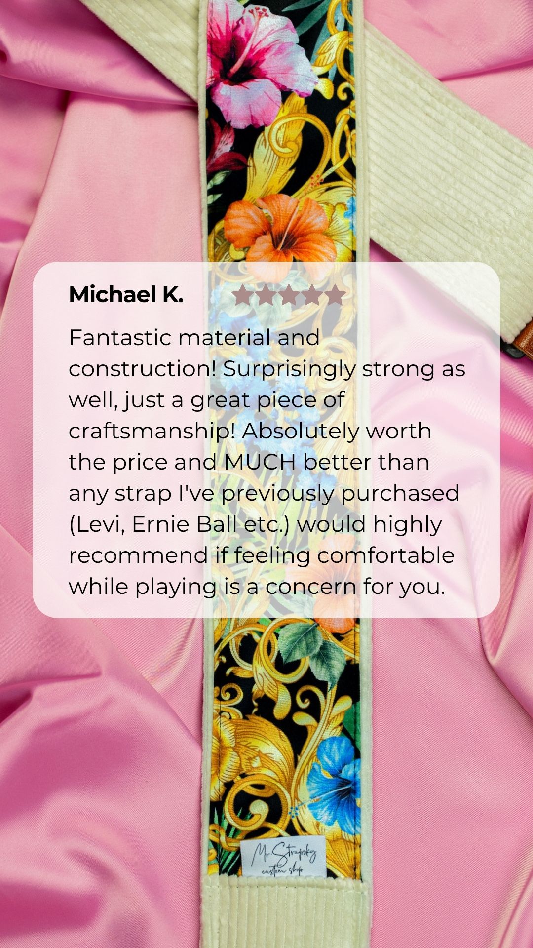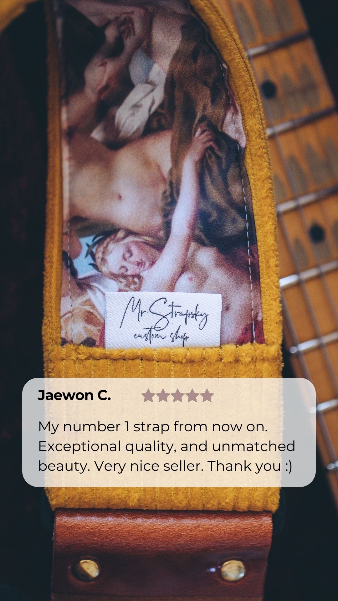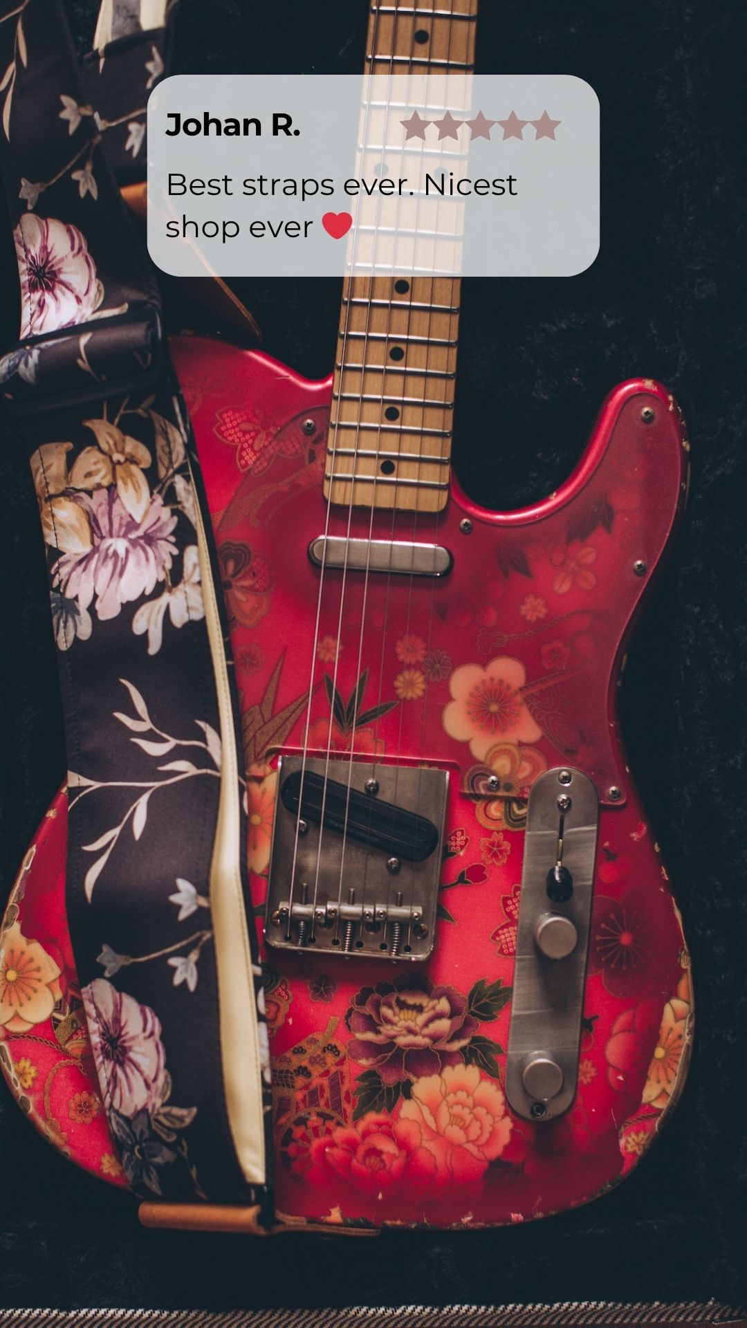 Every review you see here is 100% real written by musicians who actually play, tour, and record with my straps. You can check them any time on Mr. Strapsky Reverb or Google. This whole thing keeps growing naturally, word of mouth, no tricks. One word pops up again and again in those reviews: quality and that’s not by accident. From day one, I’ve tried to make straps that do more than just hold a guitar. Each one’s made by hand, with care, and solid materials, because I really believe every player deserves something reliable, comfortable, and made to last people keep saying the same things. That the leather is super soft, the stitching stays strong for years and the designs actually stand out. It’s not just about how they look. They talk about how the straps of Mr. Strapsky feel after hours of playing and for me, that’s huge. Whether you’re gigging all the time or just playing at home, that kind of comfort matters and so does trust.