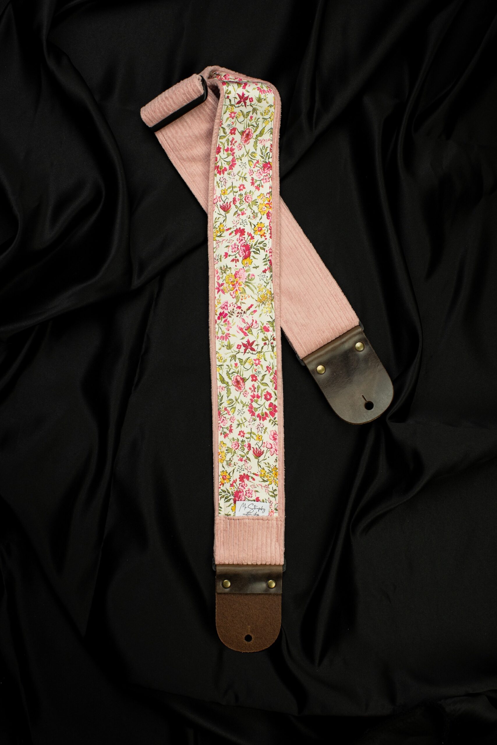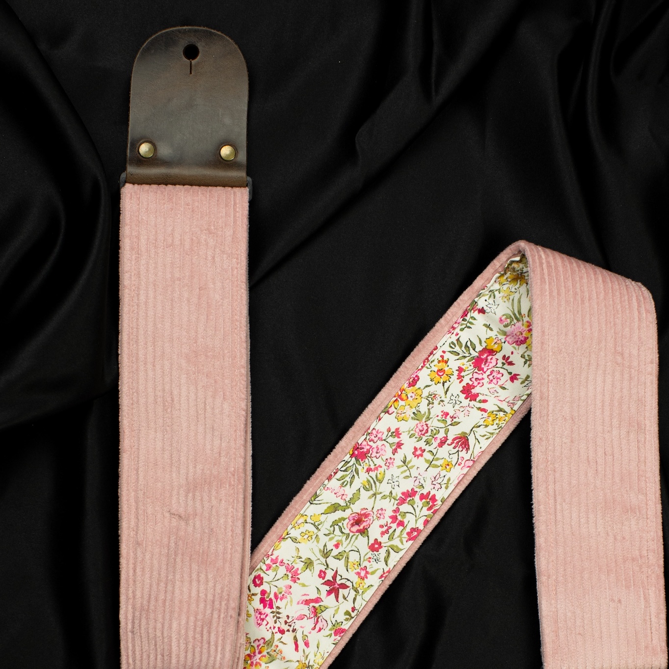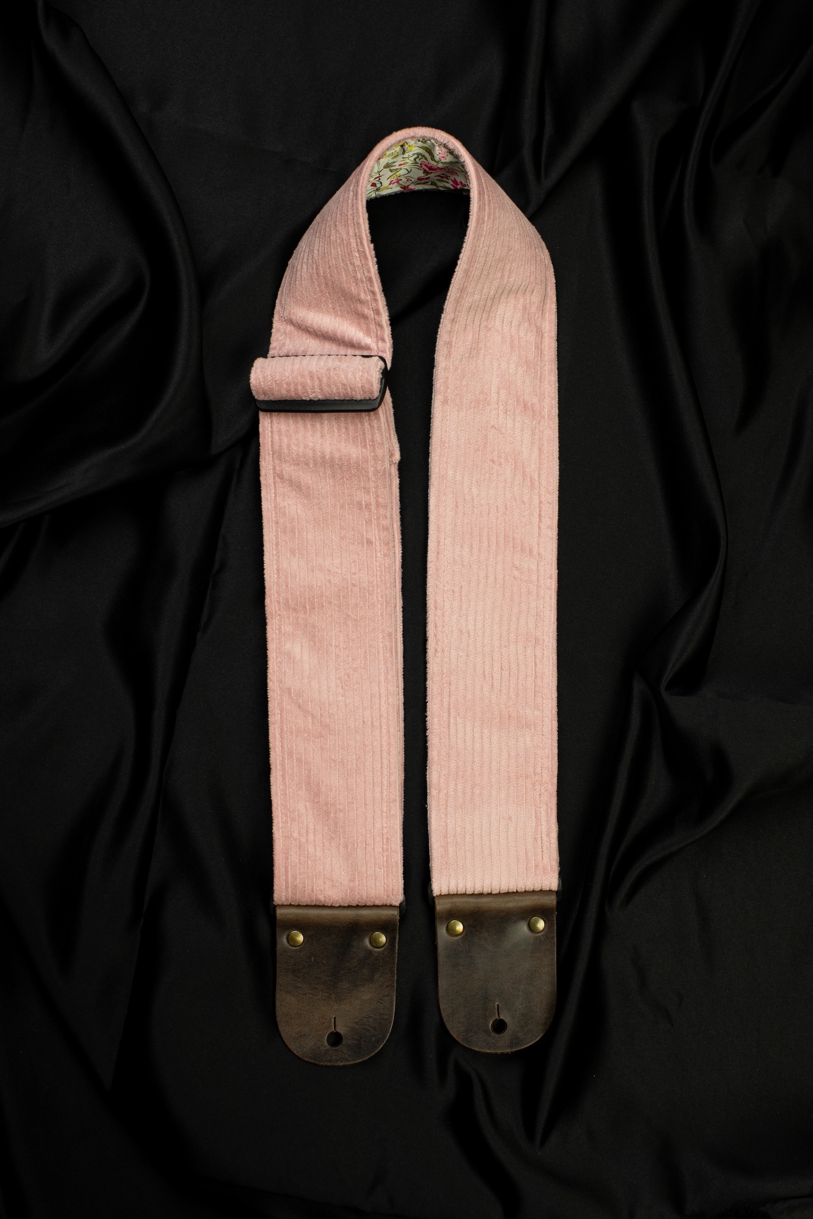 This guitar strap is a tribute to simplicity and natural beauty. The pink corduroy on the outside gives it a subtle, warm character, while the inner layer of silk chiffon features delicate wildflowers.