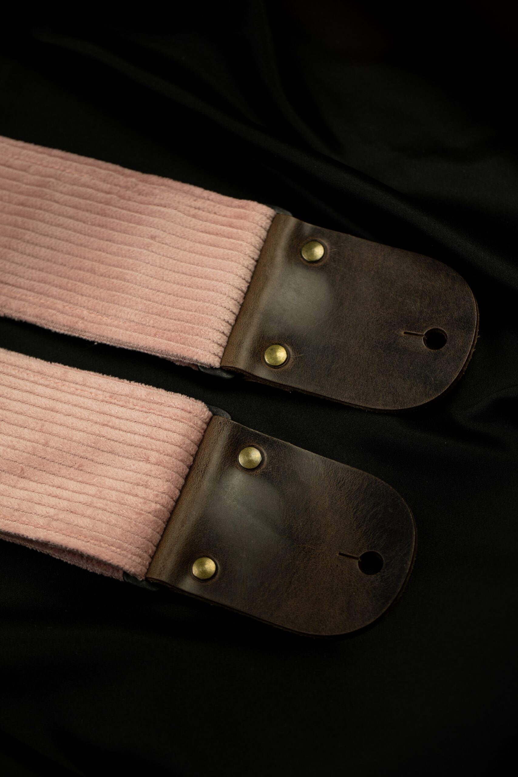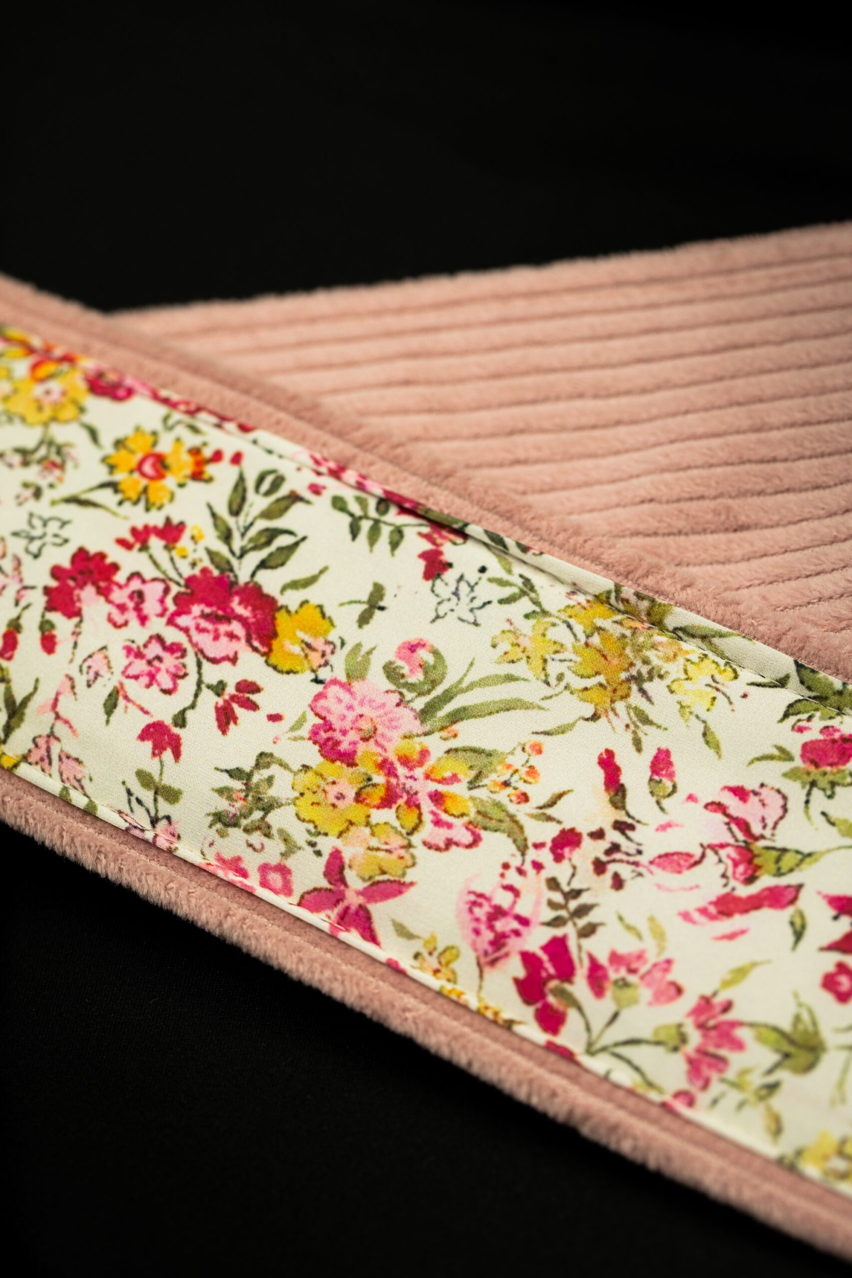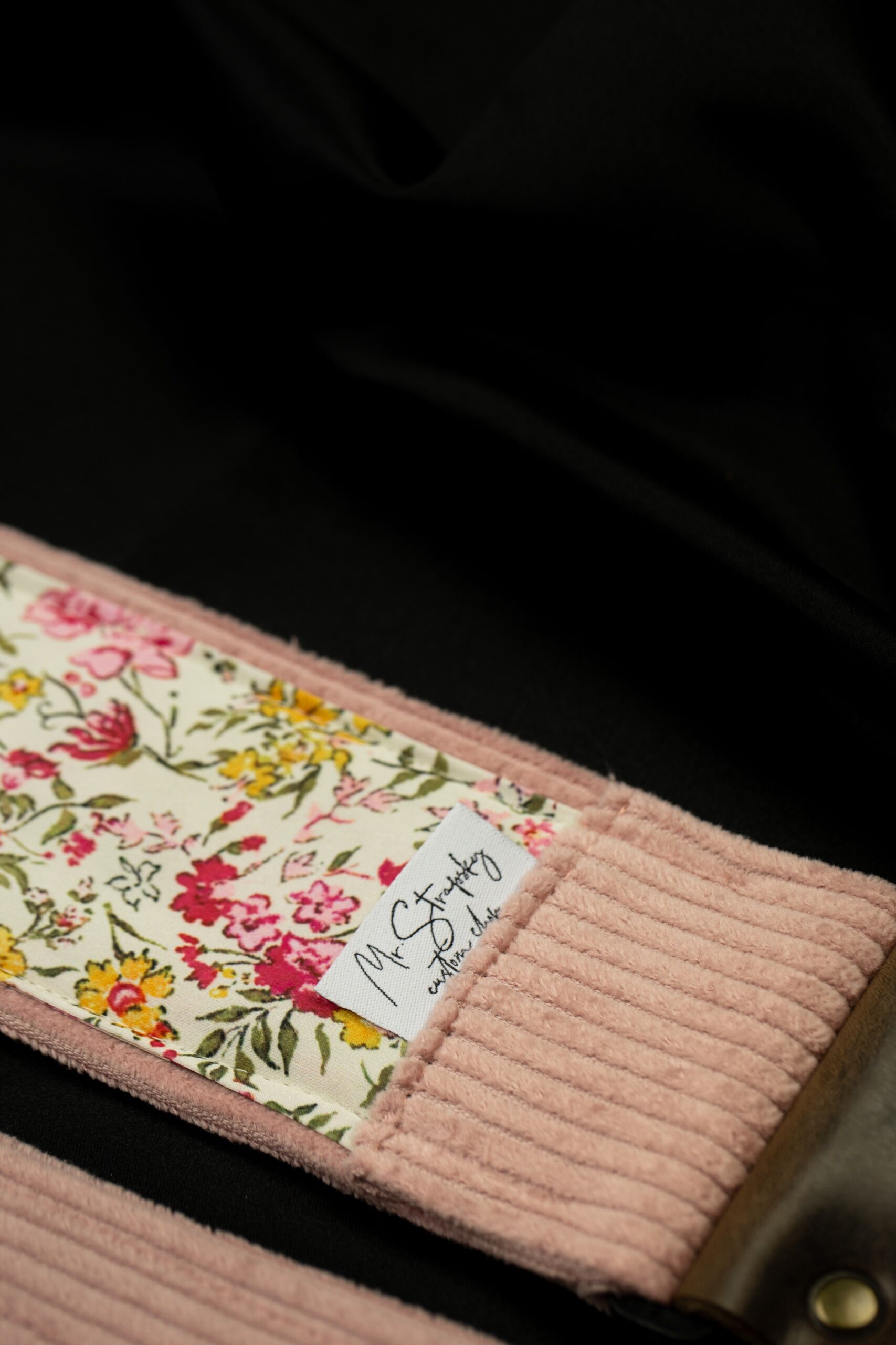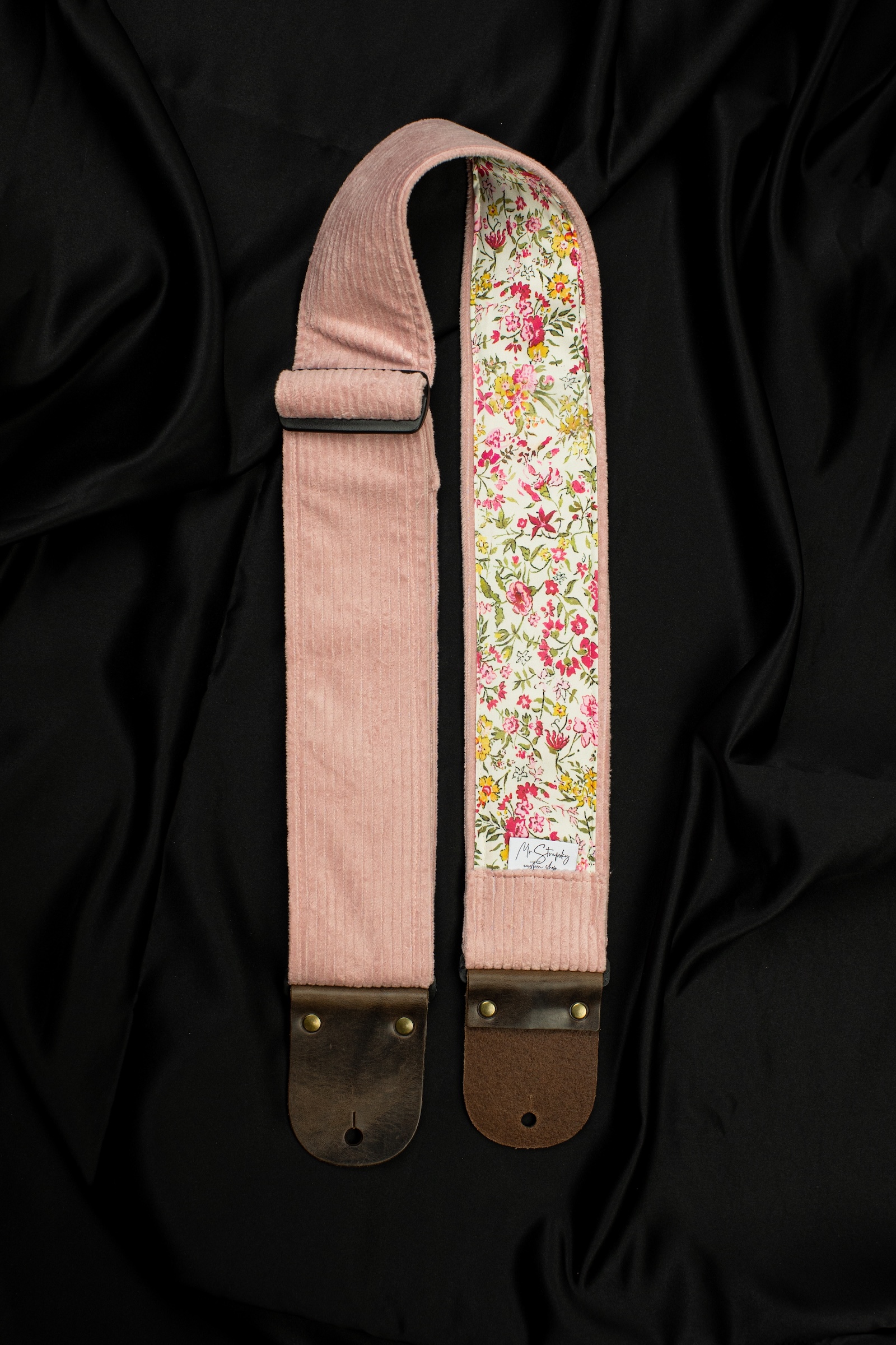 This guitar strap is a tribute to simplicity and natural beauty. The pink corduroy on the outside gives it a subtle, warm character, while the inner layer of silk chiffon features delicate wildflowers.