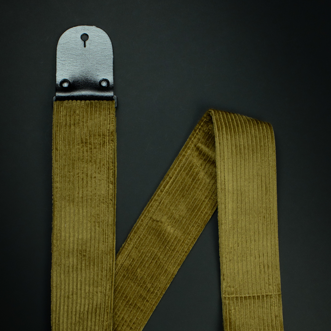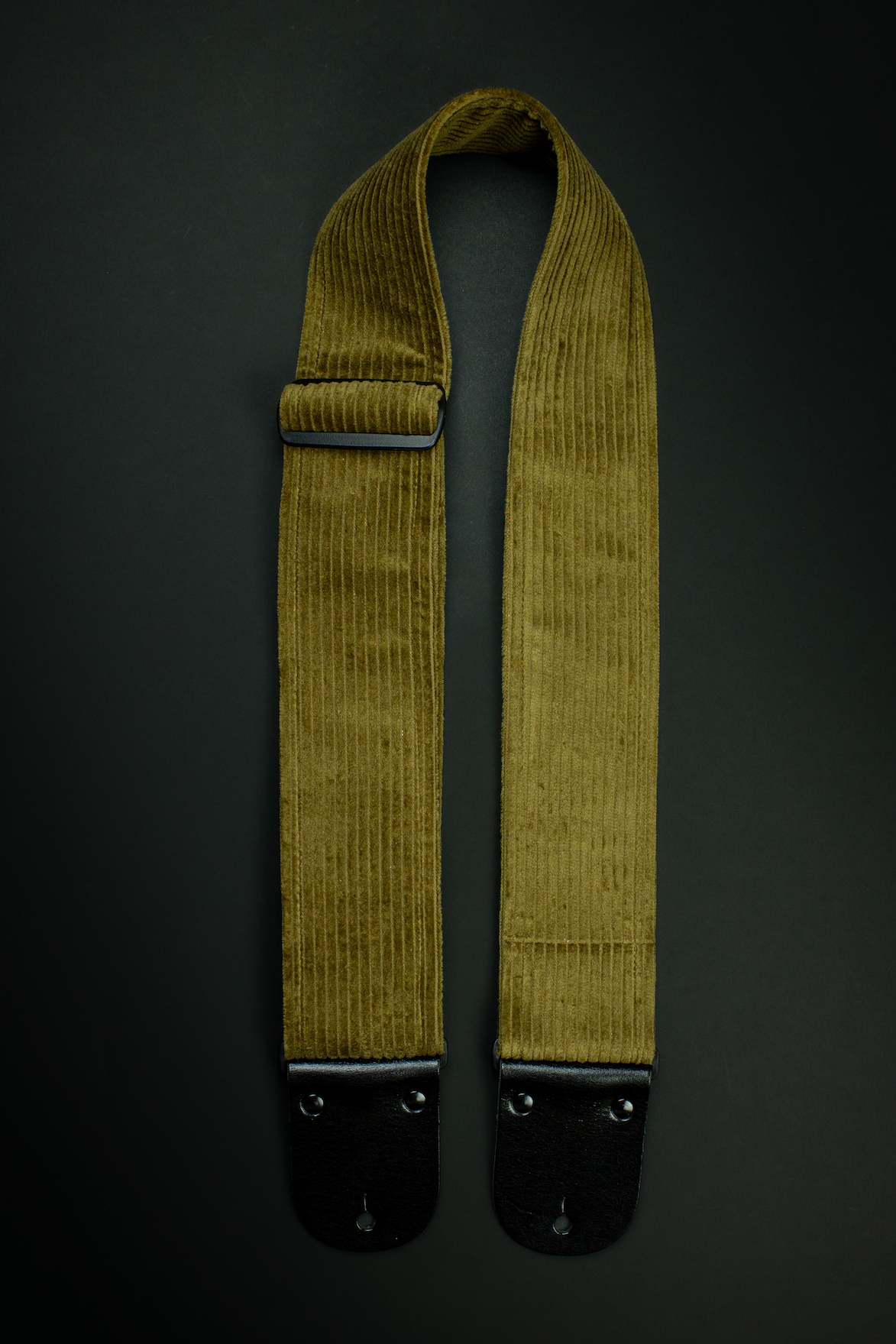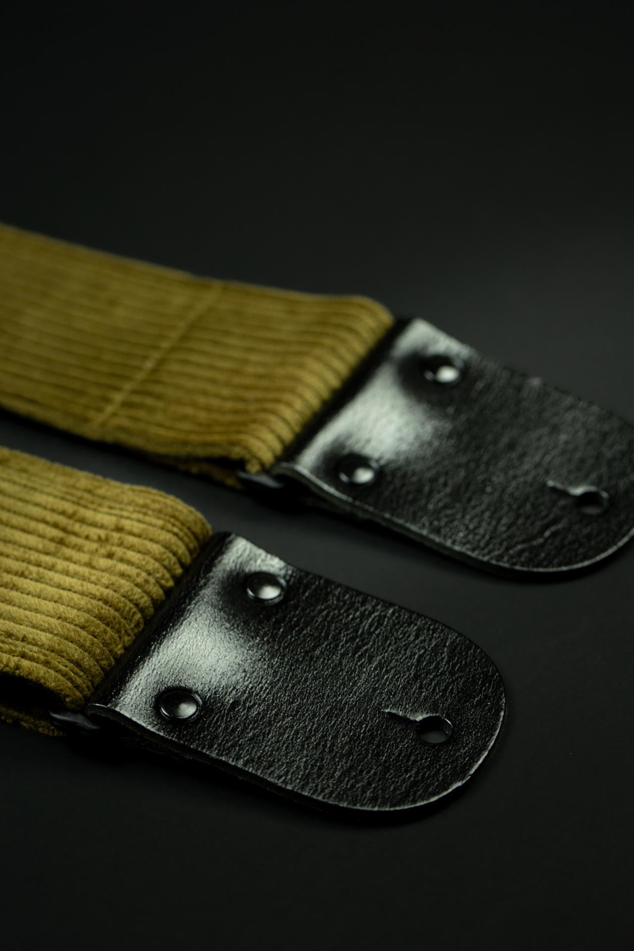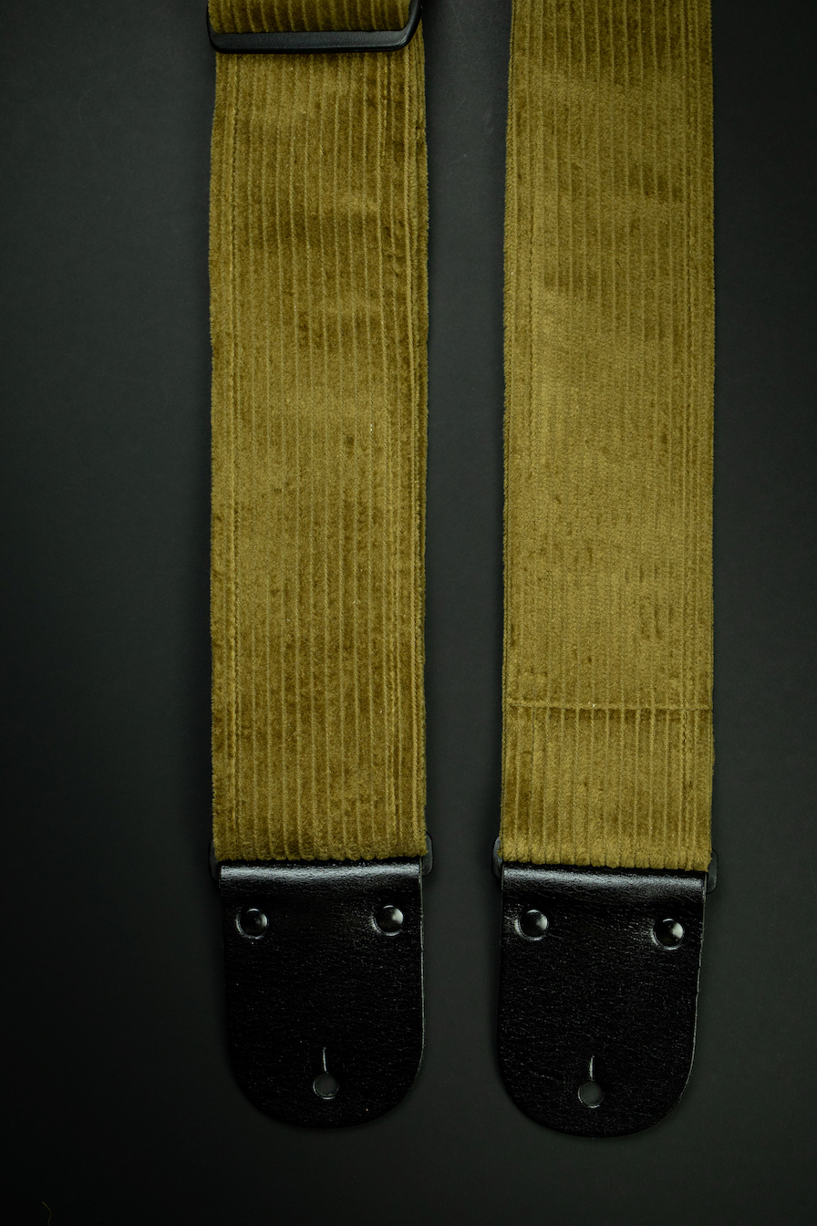 A bold and refined vintage khaki corduroy guitar strap with sleek black glossy leather ends. Strong, lightweight, and crafted for serious musicians.